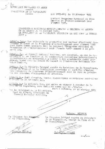 portant programme National de production et d'investissement pour l'année 1985