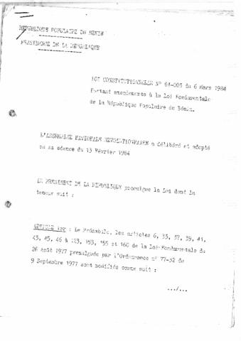 Portant amendements à la Loi Fondamentale de la République Populaire du Bénin.