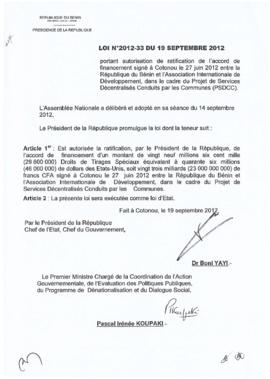 portant autorisation de ratification de l’accord de financement signé à Cotonou le 27 Juin 2012 entre la République du Bénin et l’Association Internat...