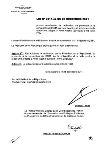 portant autorisation de ratification du protocole à la convention de l'OUA sur la prévention et la lutte contre le terrorisme, adopté à Addis-Abeba (E...
