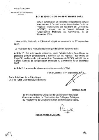 portant autorisation de ratification du protocole portant amendement à l'accord sur les aspects des droits de propriété Intellectuelle qui touchent au...