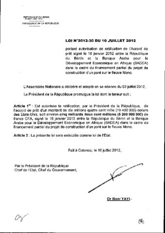 portant autorisation de ratification de l'accord de prêt signé le 18 janvier 2012 entre la République du Bénin et la Banque Arabe pour le Développemen...