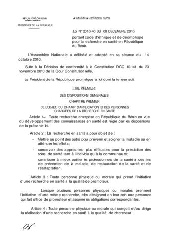 portant code d'éthique et de déontologie pour la recherche en santé en République du Bénin