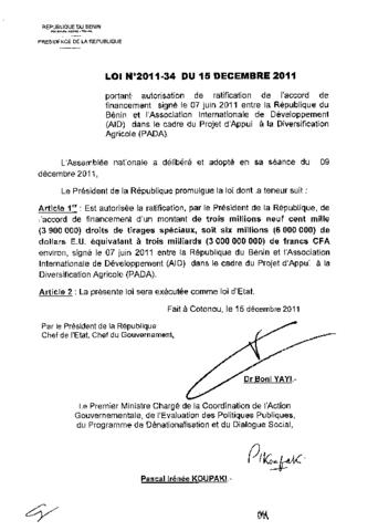 portant autorisation de ratification de l’accord de financement signé le 7 juin 2011 entre la République du Bénin et l’Association Internationale de D...