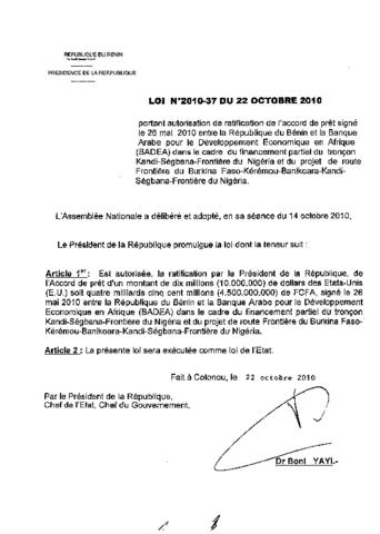 portant autorisation de ratification de l’accord de prêt signé le 26/03/2010 entre la République du Bénin et la Banque Arabe pour le Développement Eco...