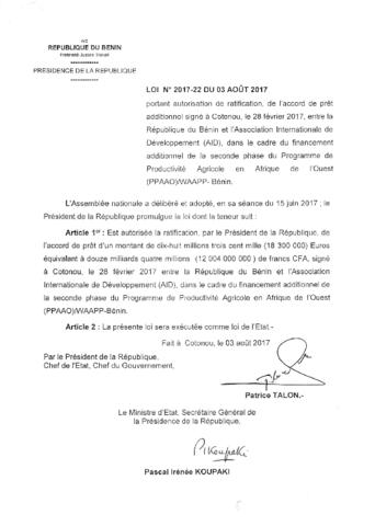 portant autorisation de ratification de l'accord de prêt additionnel signé à cotonou, le 28 février 2017, entre la République du Bénin et l'associatio...