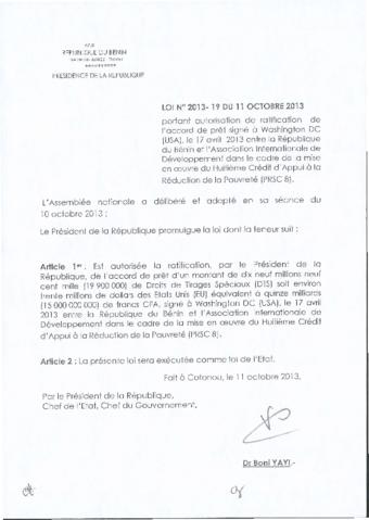 portant autorisation de ratification de l’accord de prêt signé à Washington DC (USA), le 17 avril 2013, entre la République du Bénin et l’Association...