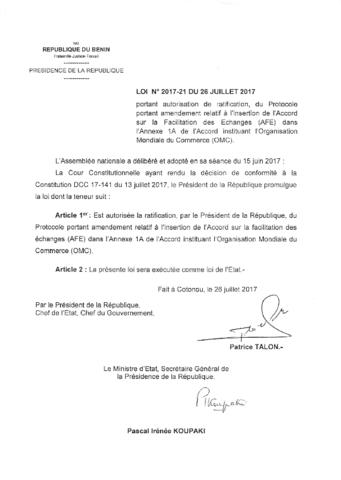 LOI N°2017-21 DU 26 JUILLET 2017