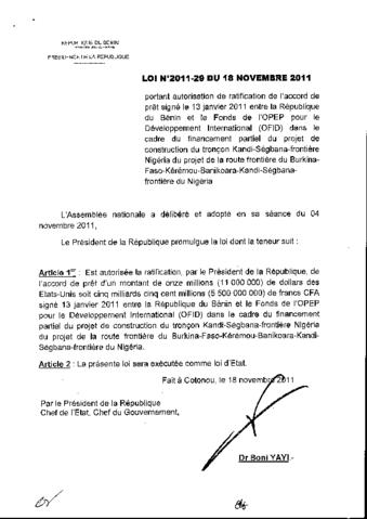 portant autorisation de ratification de l'accord de pret signé le 13 Janvier 2011 entre la République du Bénin et le Fonds OPEP pour le Développement...