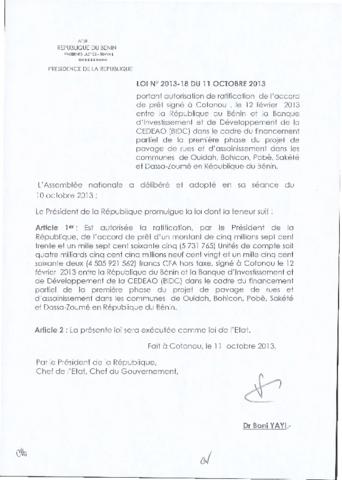 portant autorisation de ratification de l’accord de prêt signé à Cotonou le 12 Février 2013 entre la République du Bénin et la Banque d’Investissement...