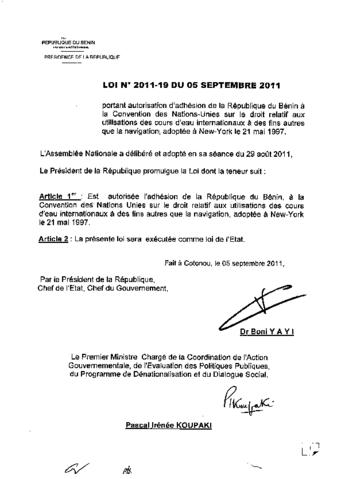portant autorisation d''adhésion de la République du Bénin à la Convention des Nations-Unies sur le droit relatif aux utilisations des cours d'eaux in...