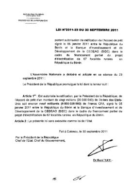 portant autorisation de ratification de l'Accord de prêt signé le 06 Janvier 2011 entre la République du Bénin et la Banque d'Investissement et de Dév...