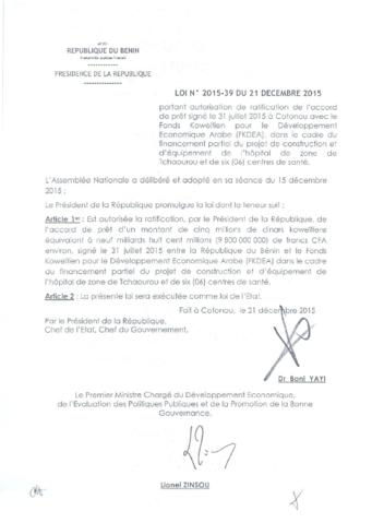 portant autorisation de ratification de l'accord de prêt signé le 31 Juillet 2015 à Cotonou avec le Fonds KOWEÏTIEN pour le Développement Economique A...