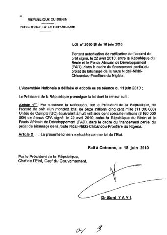Portant autorisation de ratification de l'accord de prêt signé, le 22 avril 2010, entre la République du Bénin et le Fonds Africain de Développement (...