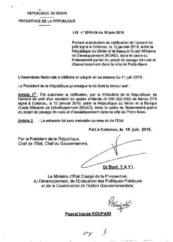 Portant autorisation de ratification de l'accord de prêt signé à Cotonou, le 12 janvier 2010, entre la République du Bénin et la Banque Ouest Africain...