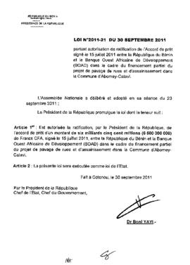 portant autorisation de ratification de l'accord de prêt signé le 15 juillet 2011 entre la République du Bénin et la Banque Ouest Africaine de Dévelop...
