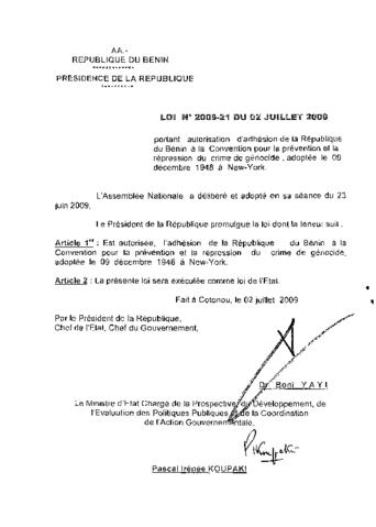 portant autorisation d'adhésion de la République du Bénin à la Convention pour la prévention et la répression du crime de génocide, adoptée le 09 déce...