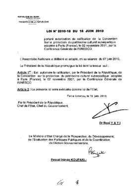 portant autorisation de ratification de la convention sur la protection du patrimoine culturel subaquatique adoptée à paris (France), le 02 septembre...