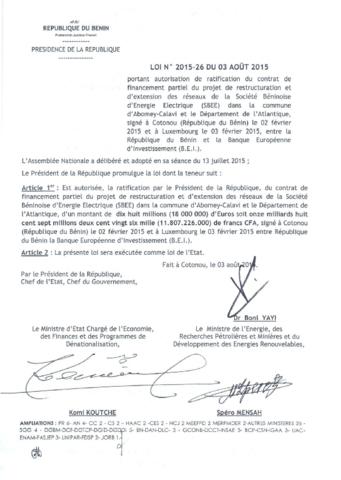 portant autorisation de ratification du contrat de financement partiel du projet de restructuration st d'extension des réseaux de la Société Béninoise...