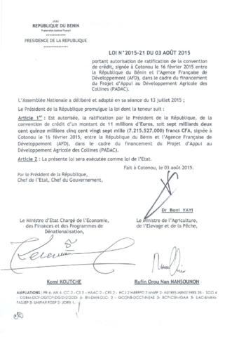 portant autorisation de ratification de la convention de crédit, signé à Cotonou le 16 février 2015 entre la République du Bénin et l'Agence Française...