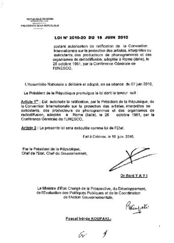 portant autorisation de ratification de la Convention Internationale sur la protection des artistes interprètes ou exécutants, des producteurs de phon...