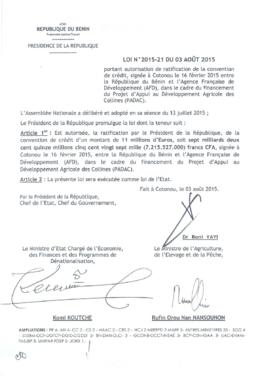 portant autorisation de ratification de la convention de crédit, signée à Cotonou le 16 février 2015 entre la République du Bénin et l'Agence Fr...