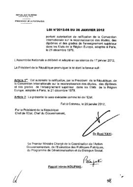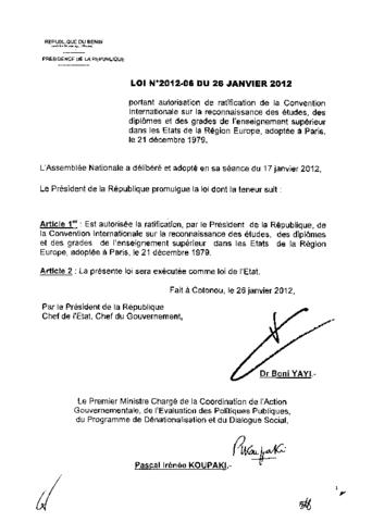 portant autorisation de ratification de la Convention Internationale sur la reconnaissance des études, des diplômes et des grades de l'enseignement su...