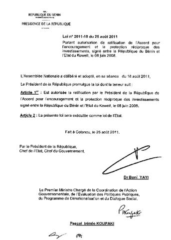 portant autorisation de ratification de l’accord pour l’encouragement et la protection réciproque des investissements, entre la République du Bénin et...