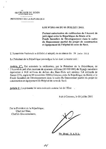 portant autorisation de la ratification de l'accord de prêt signé entre la République du Bénin et le Fonde Saoudien de développement dans le cadre du...