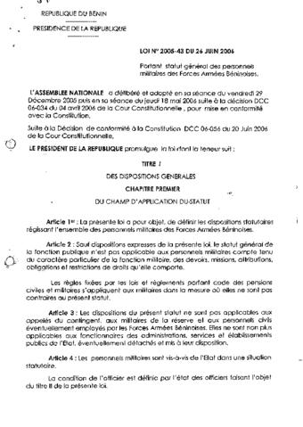 portant statut général des personnes militaires des forces Armées Béninoises