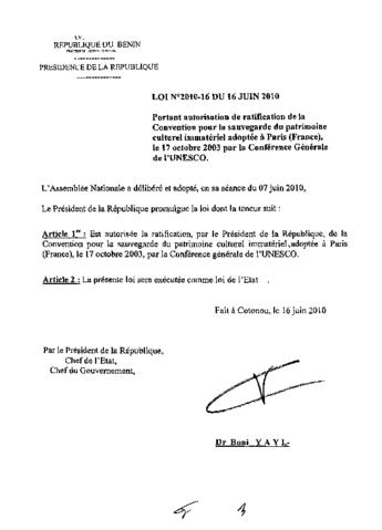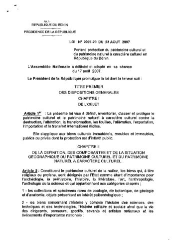 portant protection du patrimoine culturel et du patrimoine naturel à caractère culturel en République du Bénin