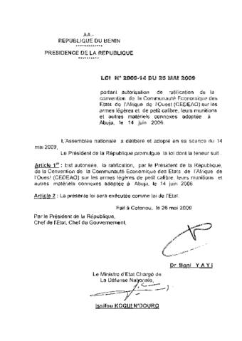 portant autorisation de ratification de la convention de la CEDEAO sur les armes légères et de petits calibres, leurs munitions et autres matériels co...
