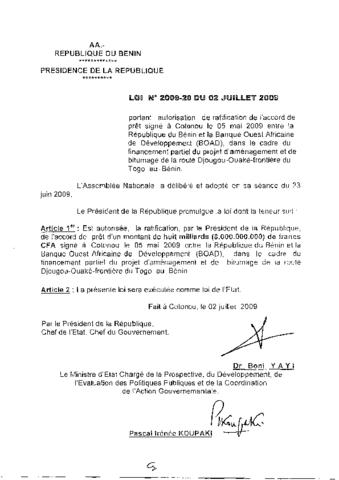 portant autorisation de ratification de l'accord de prêt signé à Cotonou le 05 mai 2009 entre la République du Bénin et la Banque Ouest Africaine de d...