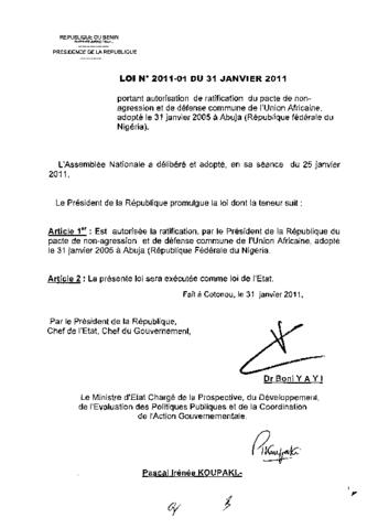 portant autorisation de ratification du pacte de non agression et de défense commune de l'Union Africaine, adopté le 31 janvier 2005 à Abuja (Républiq...