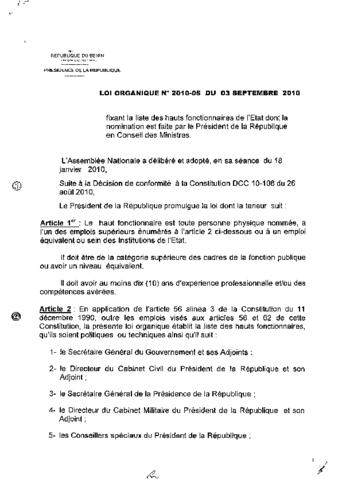 LOI N°2010-05 DU 03 SEPTEMBRE 2010