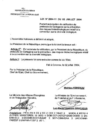 portant autorisation de ratification du protocole de Cartagena sur la prévention des risques biotechnologiques relatif à la convention sur la diversit...