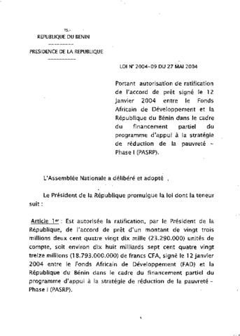 portant autorisation de ratification de l'accord de prêt signé le 12 janvier 2004 entre le Fonds Africain de Développement et la République du Bénin d...