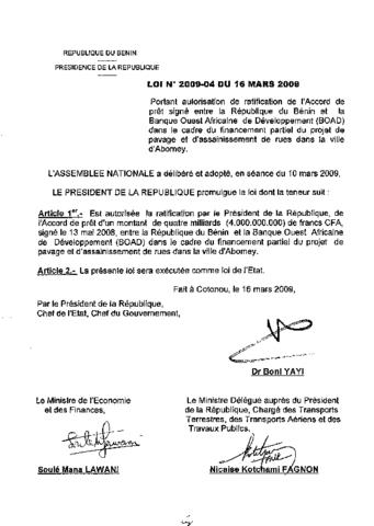 portant autorisation de ratification de l'Accord de prêt signé entre la République du Bénin et la Banque Ouest Africaine de Développement (BOAD) dans...