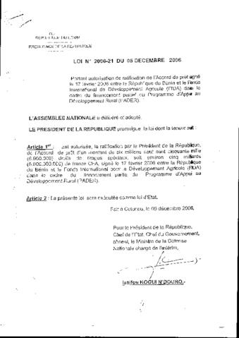 portant autorisation de ratification de l'Accord de prêt signé le 17 févier 2006 entre la République du Bénin et le Fonds International de Développeme...