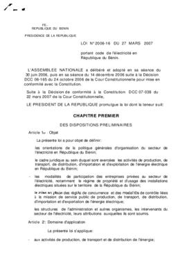 portant code de l'électricité en République du Bénin.