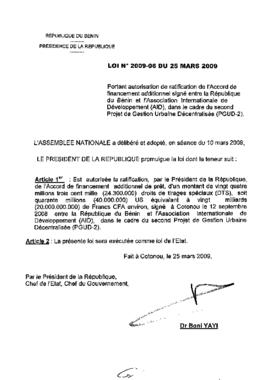 portant autorisation de ratification de l'accord de financement additionnel signé entre la République du Bénin et l'association internationale de Déve...