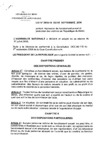 portant répression du harcèlement sexuel et protection des victimes en République du Bénin