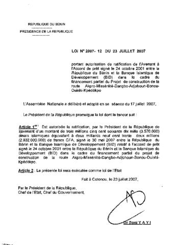 portant autorisation de ratification de l'avenant à l'accord de prêt signé le 24 octobre 2001 entre la République du Bénin et la banque Islamique de d...
