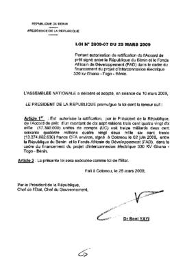 portant autorisation de ratification de l'Accord de prêt signé entre la République du Bénin et le Fonds Africain de Développement (FAD) dans le cadre...
