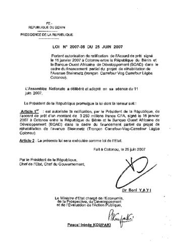 portant autorisation de ratification de l'accord de prêt signé le 16 janvier 2007 à Cotonou entre la République du Bénin et la Banque Ouest Africaine...