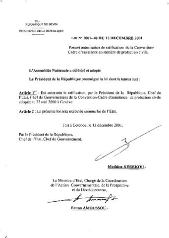 portant autorisation de ratification de la convention-cadre d’assistance en matière de protection civile.
