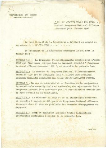 portant Programme National d'Investissement pour l'année 1990.