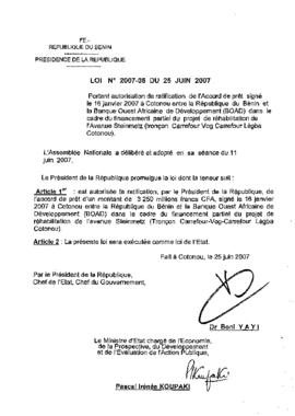 portant autorisation de ratification de l’accord de prêt signé le 16 janvier 2007 à Cotonou entre la République du Bénin et la Banque Ouest Africaine...