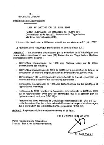 portant autorisation de ratification de quatre (04) conventions et de deux (02)protocoles de l'organisation Maritime Internationale (OMI)