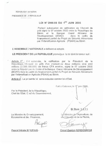 portant autorisation de ratification de l’accord de prêt signé le 07 octobre 2005 entre la République du Bénin et la Banque Ouest Africaine de Dévelop...